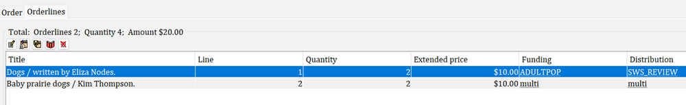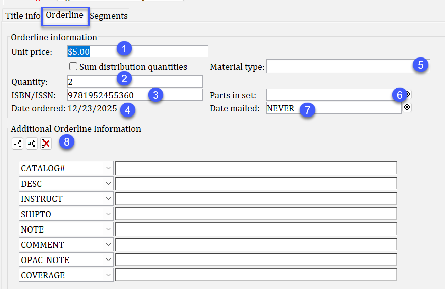 When you display each orderline, you will see three tabs: Title Info, Orderline, and Segments.