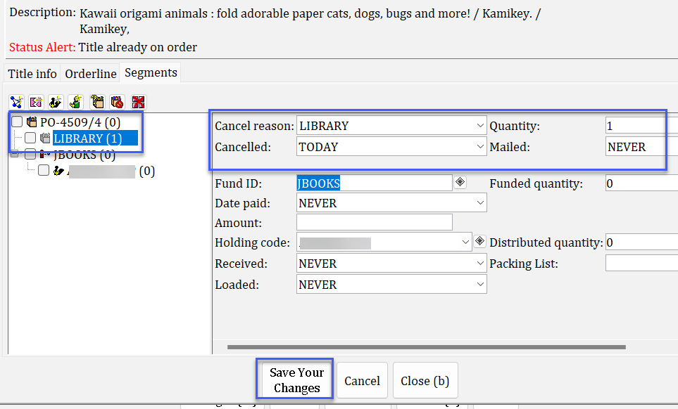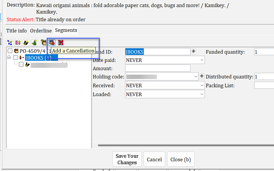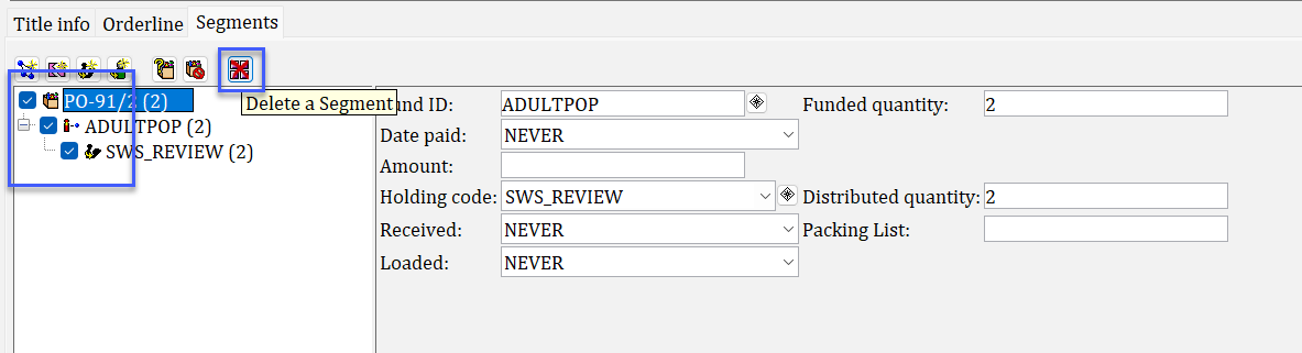 Click on the Segments tab. By default, all quantities ordered are assigned the same fund ID and holding code. To change this, you must delete that original cluster. Do this by checking the boxes for the existing cluster in the order tree and clicking the Delete a Segment Tool.