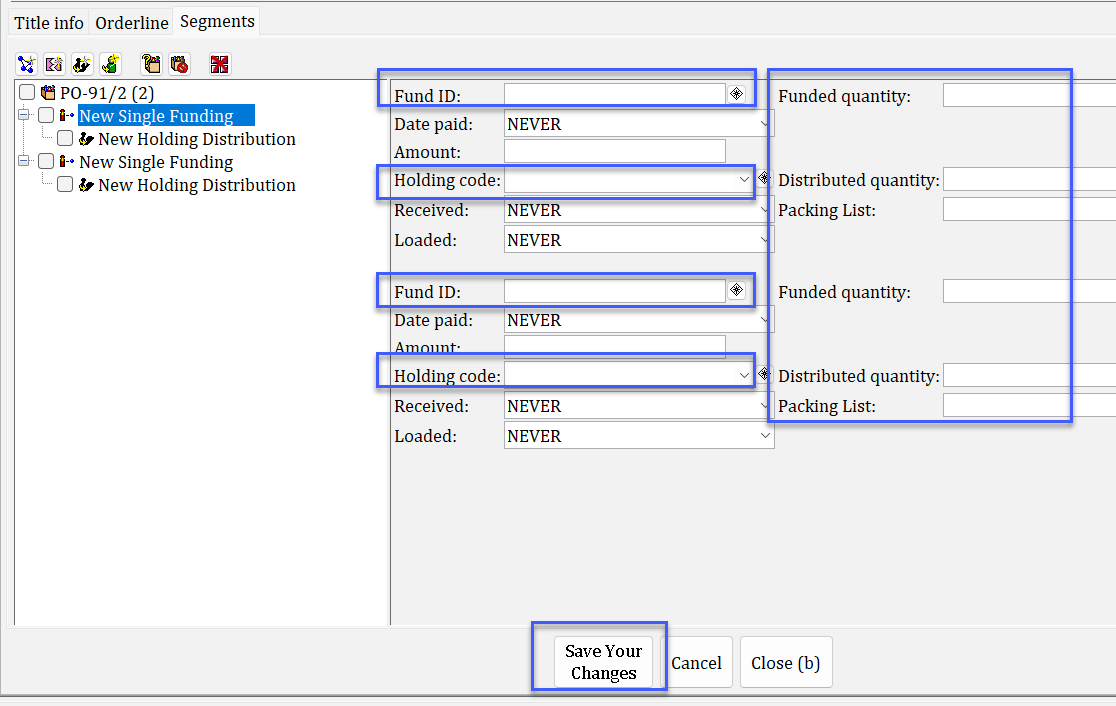 If your library has ordered more than one copy of an orderline, you may have just one fund ID and holding code that applies to all copies ordered. However, this may not always be the case. Sometimes you may need to split the quantity ordered into multiple funding/distribution clusters. To do this, please see the steps below.