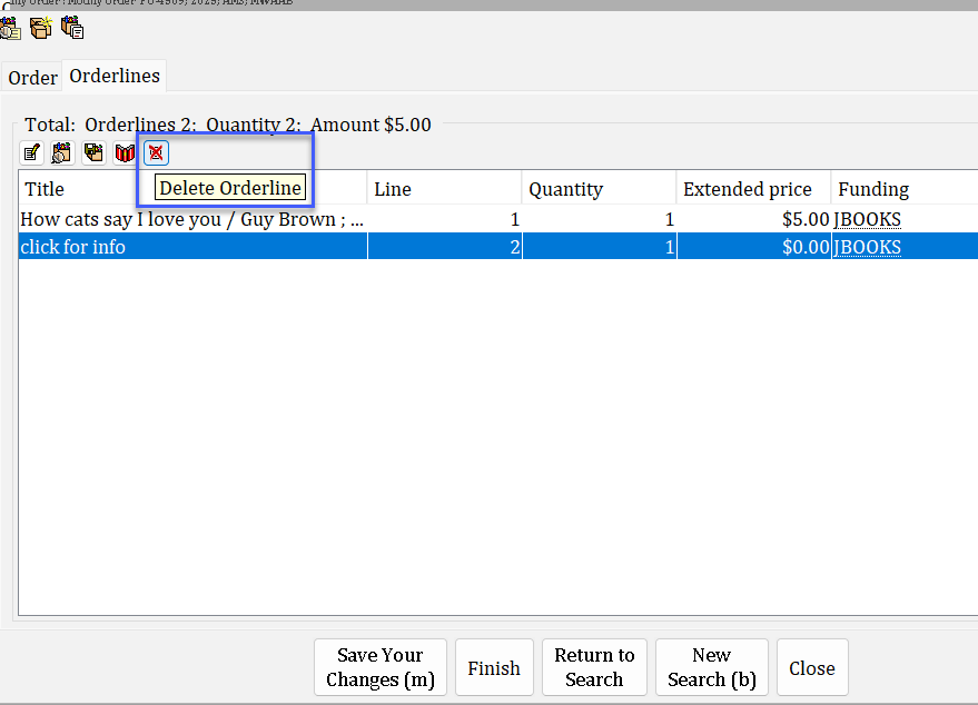 There are times when you need to remove an orderline entirely. It could have been created by accident or a publisher has notified you that the order will never be filled. If the latter happens, some libraries prefer to cancel the orderline, while others like to delete it outright.