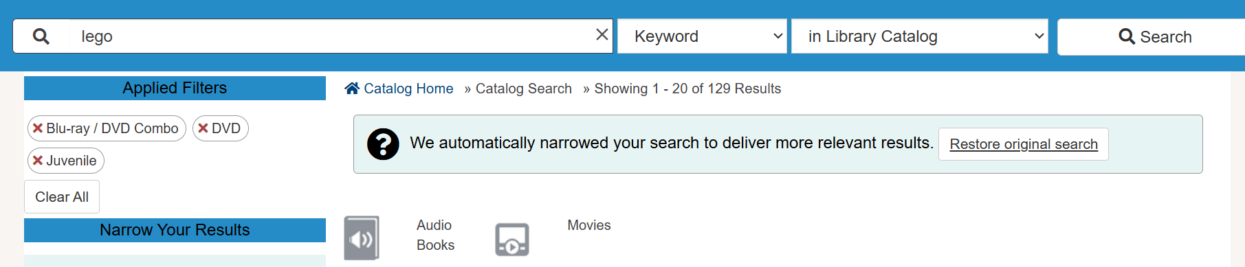 If a patron wants to clear the automatically applied filters, they'll have the option to Restore original search from their search results.